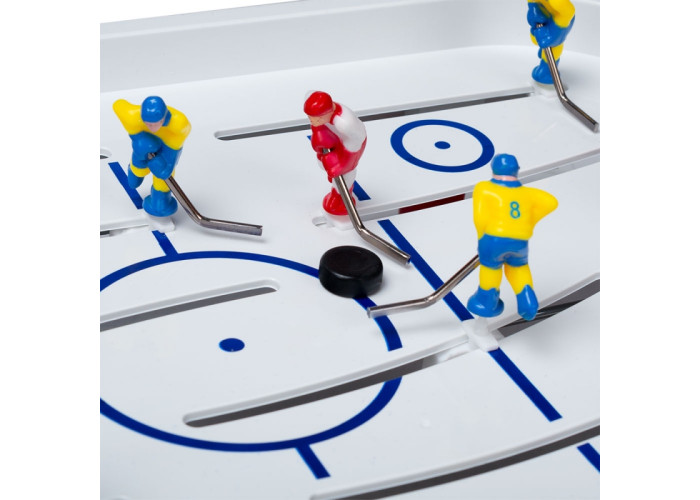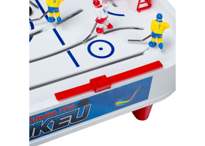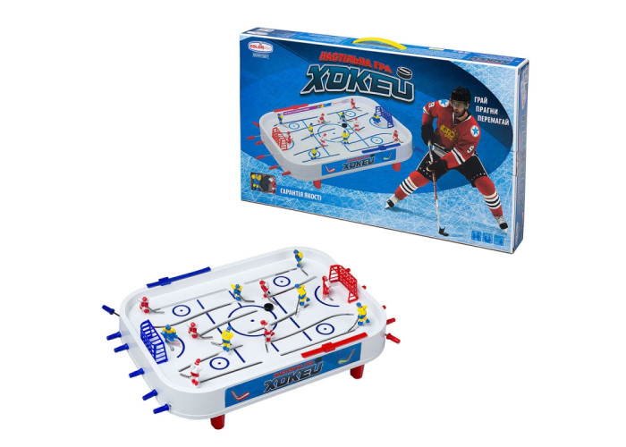 Комплектація: ігрове поле, хокеїсти (10шт), воротарі (2шт), ніжки (4 шт), табло (2шт), шайби (2шт), наклейки (1комп), запасний механізм (1шт).