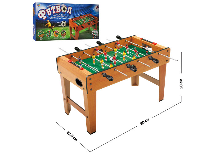 Настільний футбол приведе в захват і зацікавить не тільки вашого синочка, а та його тата, забиваючи голи у ворота один одного. Великий розмір ігрового поля і розташування гравців на полі додадуть грі реальності, а гравцям додадуть азарту і прагнення до перемоги. Гра виготовлена з натурального дерева, має складні ніжки, і її можна встановлювати як на столі, так окремо Футболісти зроблені з міцного пластику, кріпляться вони на металеві стійки, ручки в штангах пластмасові, рифлені. З кожної сторони ігрового поля є по три штанги. Ігрове поле на високих (50см) ніжках. Стіл оснащений двома механічними лічильниками. Ергономічні пластикові ручки забезпечують зручне захоплення. Настільний футбол виробляє швидкість реакції, м'якість і точність рухів, і буде дуже корисний для гармонійного розвитку дитини. Розміри гри дозволяють використовувати її в невеликих приміщеннях. Встановити Футбол можна на столі без використання ніжок або на підлозі з ніжками. Зберігання Футболу зручно і не займе багато місця. Стіл виготовлений з ДСП - міцний і надійний матеріал, з обробкою під натуральне дерево. В комплекті: лічильники забитих голів, 14 футболістів, 6 куліс (ручок), 2 м'ячі.