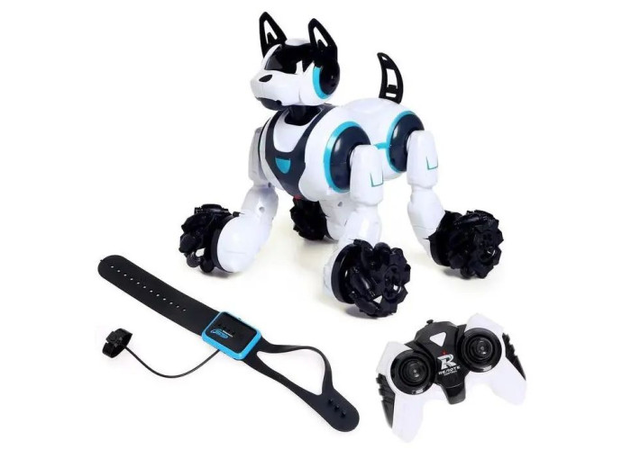 - Робот-собака виготовлений з міцного нетоксичного глянсового пластику, який стійкий до деформації і прослужить дитині тривалий час. Собакою можна керувати як за допомогою пульта, так і за допомогою браслета. Працює від акумулятора. Заряджання здійснюється за допомогою USB-проводу.