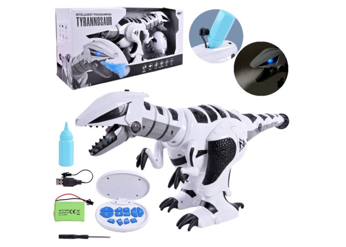 Комплектація: динозавр, пульт, ємність для води, викрутка, акумулятор і зарядка.