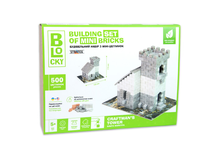- Комплектація: коробка, цеглинки - 500 ел., клей ПВА, пензлик - 1 шт., інструкція.