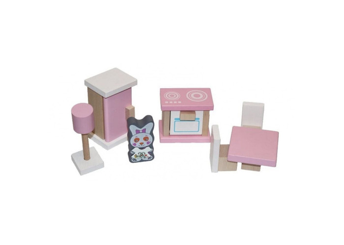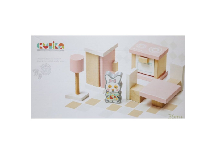 Набір дерев'яних меблів Cubika Кухня в улюбленому рожевому кольорі допомагатиме маляті програвати з іграшками дорослі щоденні дії.