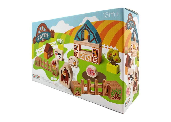 У набір входять 31 деталь, з яких можна сформувати ферму.