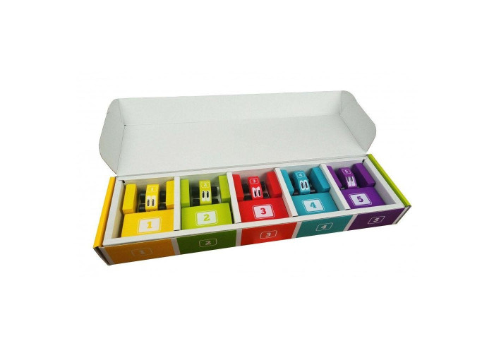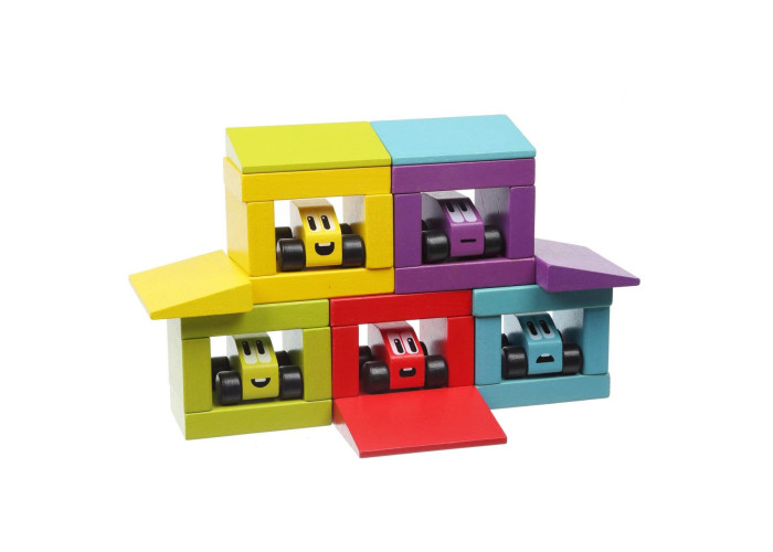 Набір складається з 5 різнокольорових машинок і 31 різнобарвного блоку різної форми.