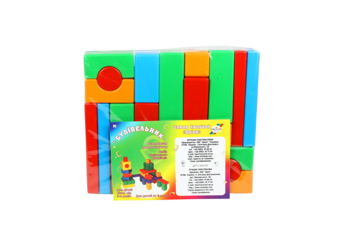 Набір Будівельник поставляється у вигляді пластмасових будівельних матеріалів типу: будівельних блоків, балок, плит перекриття, арок, кубиків, циліндрів. В склад набору входять 23 предмета: 2 циліндра, 4 кубика, 4 арки, 4 балки, 4 плити, 5 блоків. Всі предмети набору виготовляються екструзійно-видувним методом з поліетилену низького тиску. Набір має предмети чотирьох кольорів.