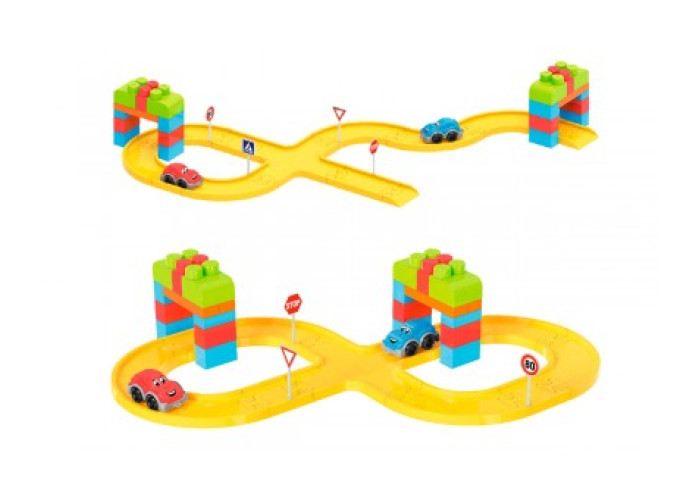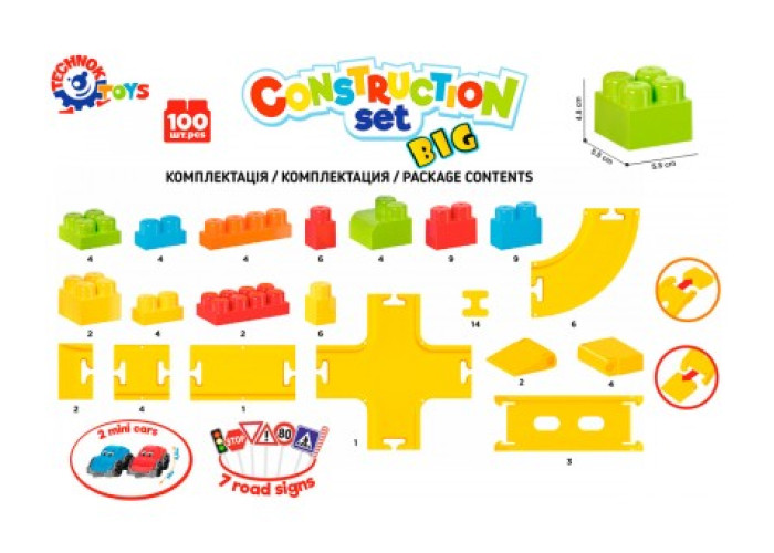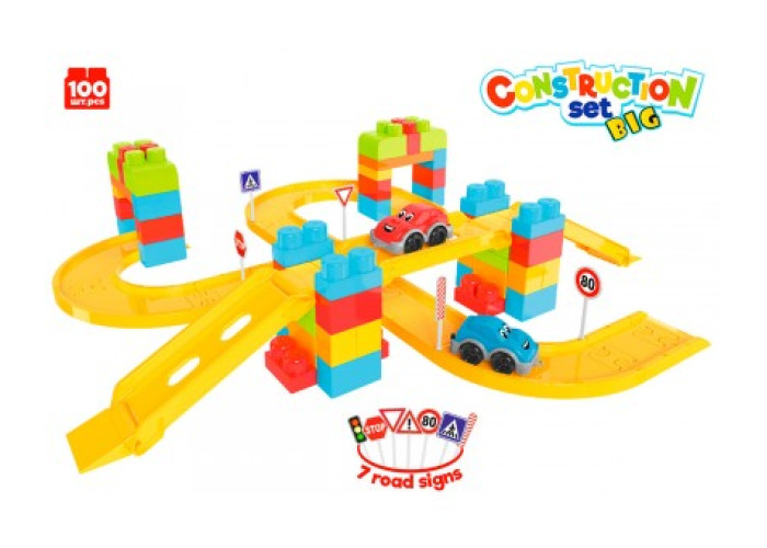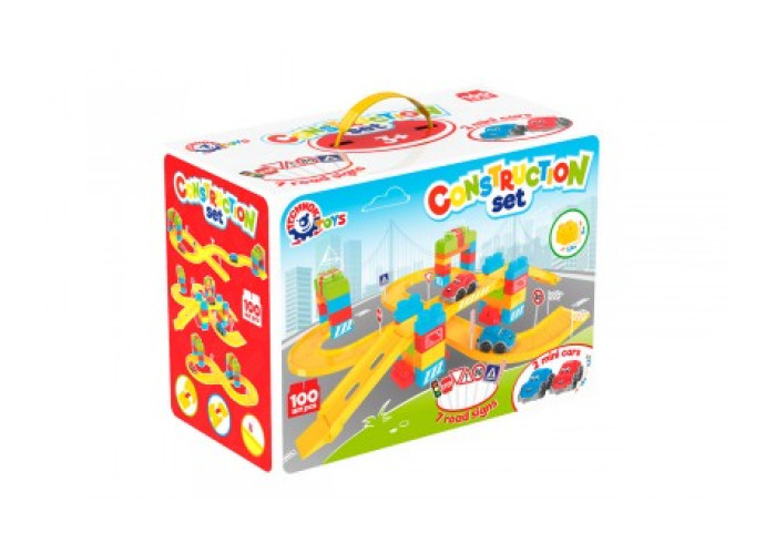 Дитячий конструктор від ТехноК – це 100 різноманітних елементів, серед яких траси з перехрестями та поворотами, спуски, дорожні знаки та машинки. Будівельна цегла велика і зручна для маленьких дітей. З них можна збудувати різні фігури: гаражі, паркінги, будиночки, кораблі або фігури тварин. Для дослідження ПДР у наборі 7 дорожніх символів. Міні машини із зображеннями "очей", нанесених шляхом тамподруку - цікава опція, що надає "життя" конструктору.