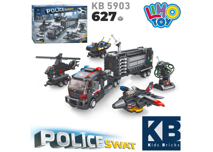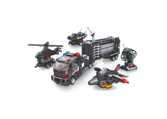 Цікавий конструктор із дрібними деталями поліцейський спецзагін. У комплекті 627 дрібних деталей, з яких складається: велика вантажівка; маленька машинка джип у 3 варіантах; літальний апарат у трьох варіантах; термінал у трьох варіантах. А ще з деталей можна зібрати різні варіанти, представлені на самій коробці.