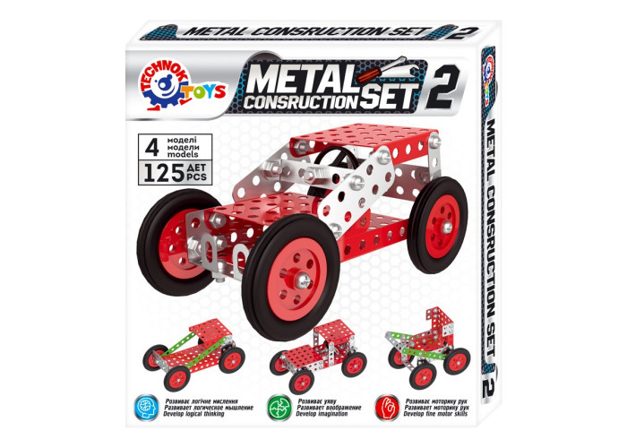 Іграшка "Конструктор металевий ТехноК" – це рівень «Beginner+». Складається зі 125 деталей, з яких можна зібрати 4 моделі середньої складності: автомобіль, коляска, автомобіль 2, автомобіль 3. Ми додали в цей комплект нові елементи, а саме гумові колеса. Радимо використовувати конструктор як для домашнього використання, так і для занять у групах у дитсадках (від 5-ти років) та у молодших класах.
