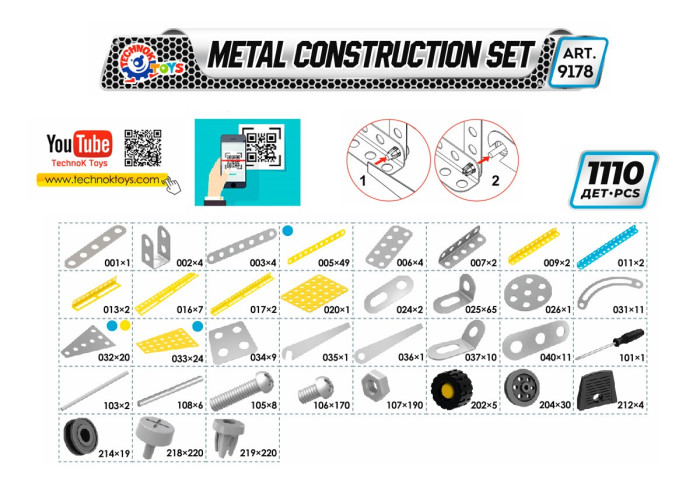 Металеві конструктори ТехноК вирізняють високою якістю та різноманіттям деталей, цікавим поєднанням металевих та пластикових запчастин. У кожному наборі є викрутка та ключі для збирання моделей. На допомогу юним механікам – кольорова, детальна покрокова інструкція, яку також можна завантажити з нашого корпоративного сайту.