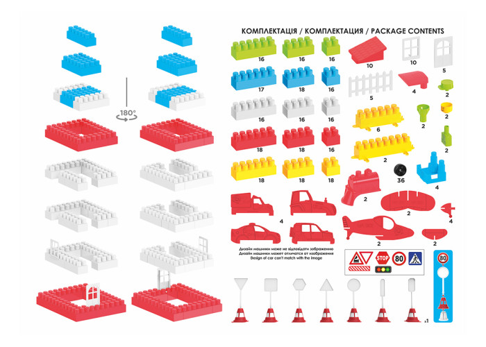 Цегла різних розмірів, віконця, двері та паркан для будівництва будиночків і замків. Набір дорожніх знаків, фігури машинок та літака знадобляться для цікавих ігор з гаражами та паркінгами.