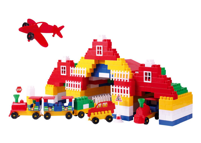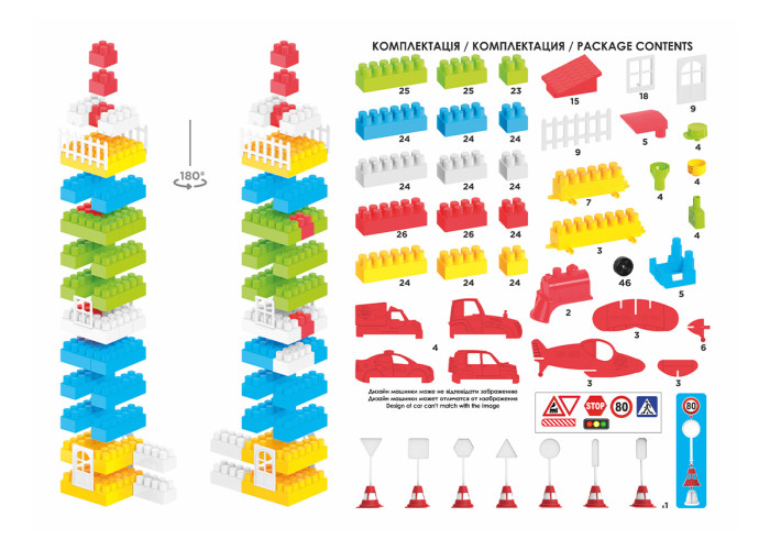 Цегла різних розмірів, віконця, двері та паркан для будівництва будиночків і замків. Набір дорожніх знаків, фігури машинок та літака знадобляться для цікавих ігор з гаражами та паркінгами.