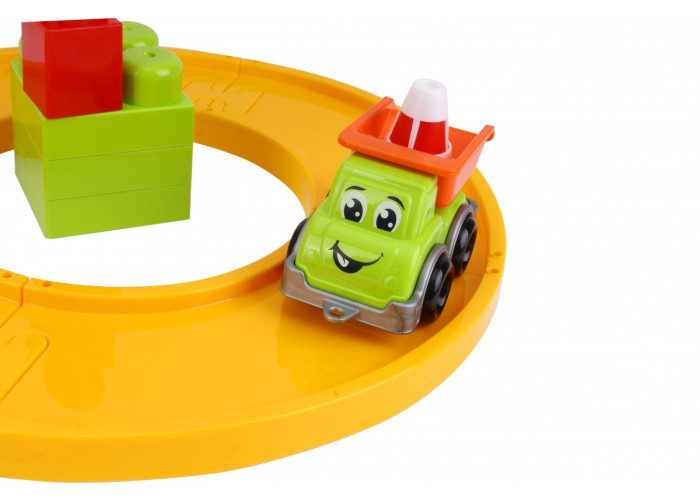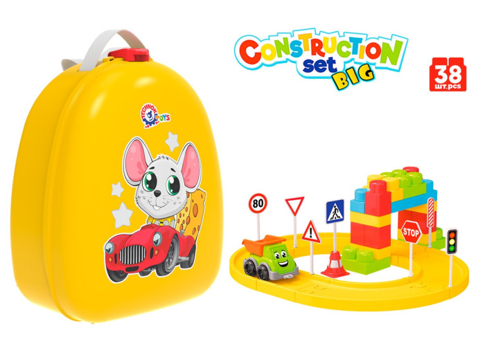 Комплектація: рюкзак, машинка самоскид, елементи автомагістралі, конструктор, дорожня знаки з наліпками.