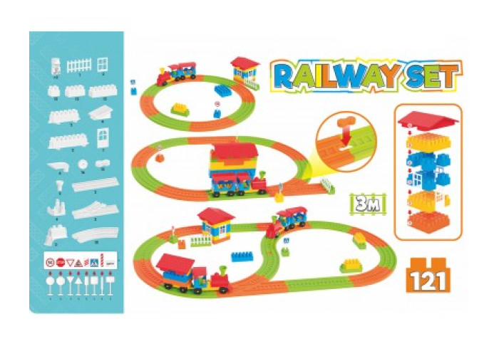 Цікава гра для малюка. В набір входить поїзд та залізнична колія, фігурки машиністів, знаків та багато іншого. Веселі кольорові наклейки. Складається зі 121 деталі.