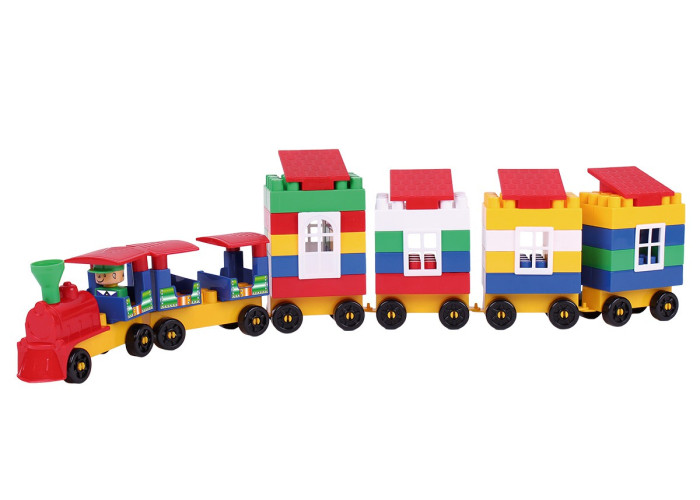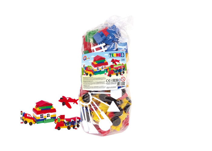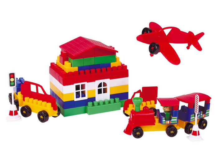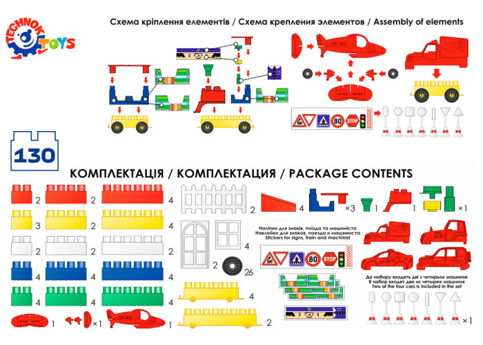 Пластиковий дитячий конструктор на 130 деталі. З деталей конструктора можна збирати будиночок і машинки. У наборі також є дорожні знаки та наклейки.