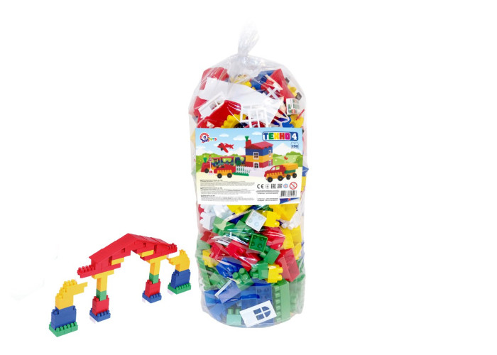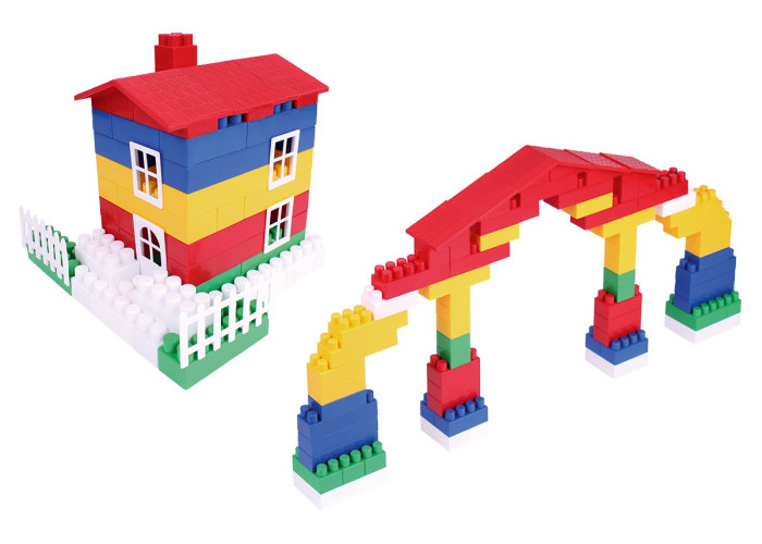 Пластиковий дитячий конструктор на 190 деталі. З деталей конструктора можна збирати будиночок і машинки. У наборі також є дорожні знаки та наклейки.
