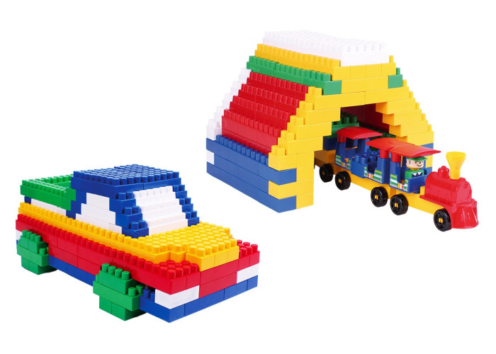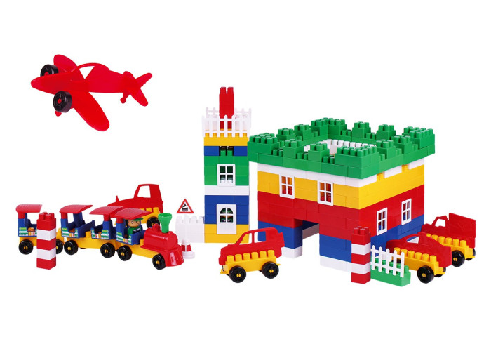 Пластиковий дитячий конструктор на 310 деталі. З деталей конструктора можна збирати будиночок і машинки. У наборі також є дорожні знаки та наклейки.