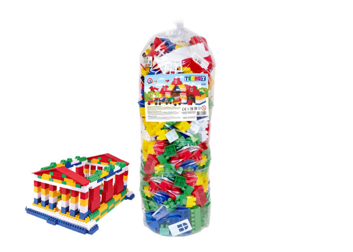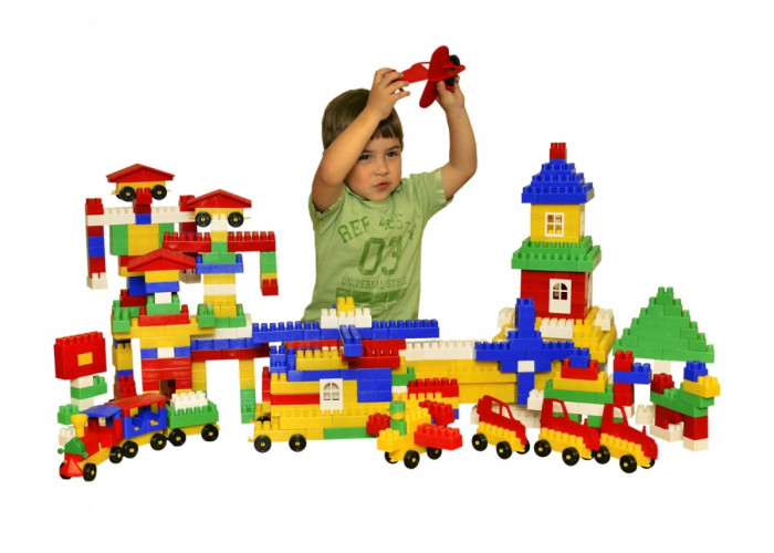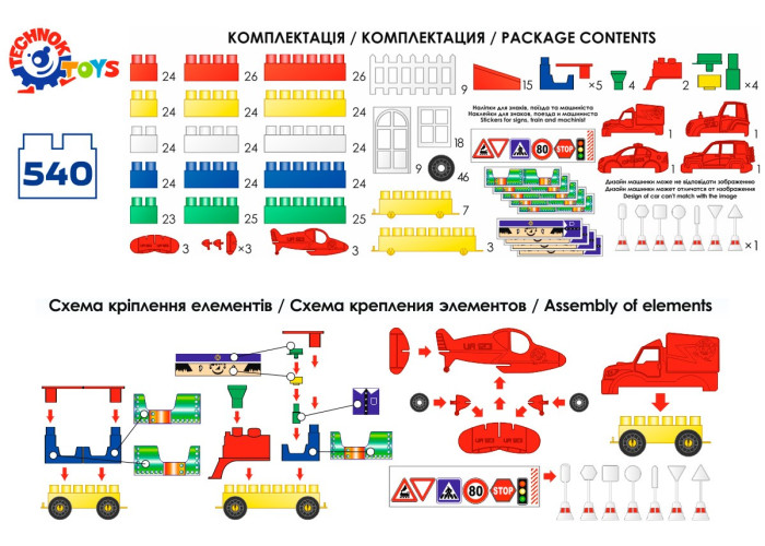 Пластиковий дитячий конструктор на 540 деталі. З деталей конструктора можна збирати будиночок і машинки. У наборі також є дорожні знаки та наклейки.