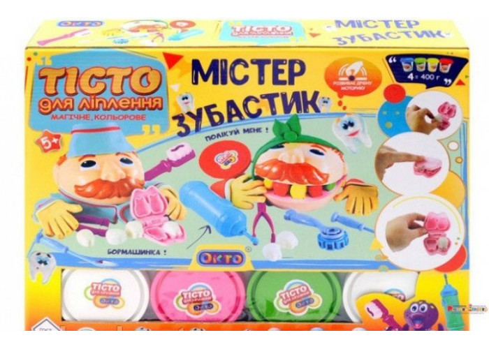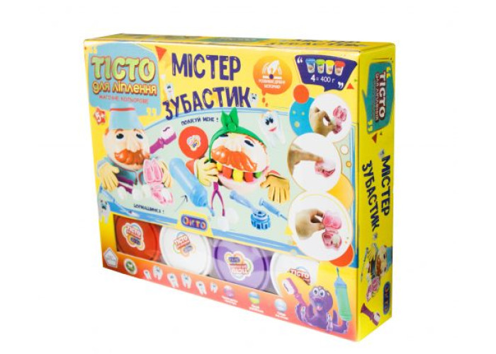 Комплектація: тісто для ліплення 560г (4 склянки по 100 г, 4 стіки по 35 г) +/- 3г.; пластиковий "Містер зубастик"; пластикова бормашина; пластикові інструменти 6шт.; інструкція.