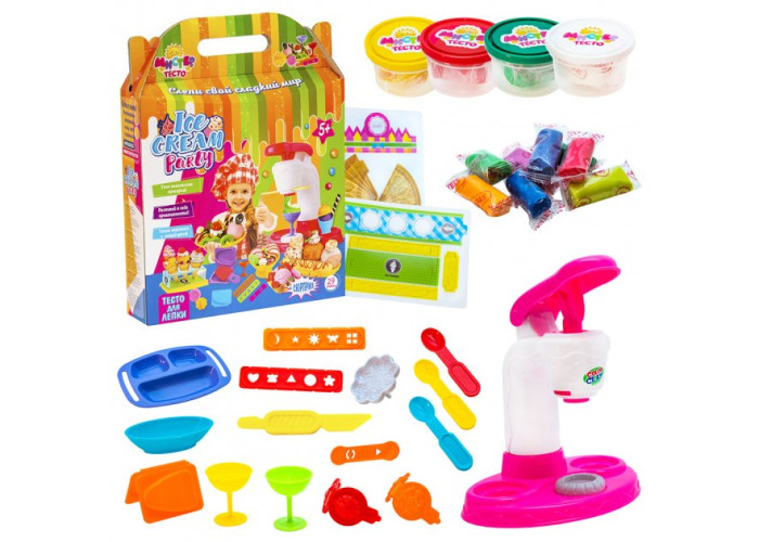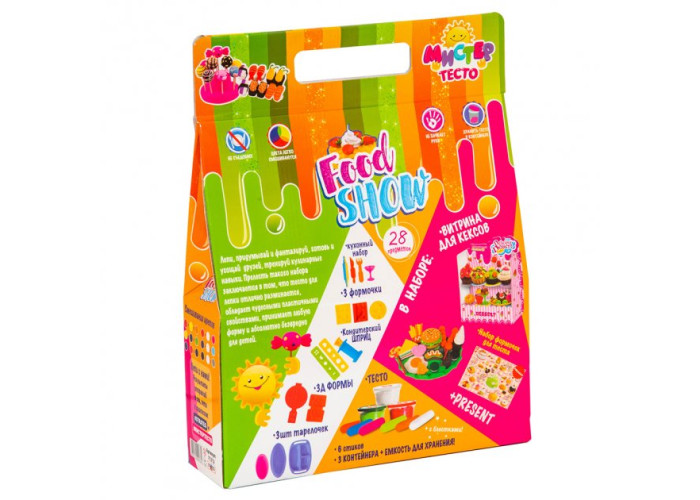 Комплектація: 3 контейнери з тестом (100 гр.), 6 паличок тіста (20 гр.), ємність для зберігання, 4 кухонних предмети, 3 форми, шприц, 2 фігурні насадки, 2 шт. 3D форм, 3 тарілки, вітрина, інструкція;