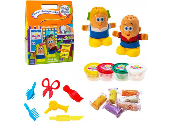 Комплектація: 3 контейнери з тестом (100 гр.), 6 паличок тіста (20 гр.), ємність для зберігання, ножиці, фен, ніж, гребінець, машинка для стрижки, 2 фігурки, 2 підставки;