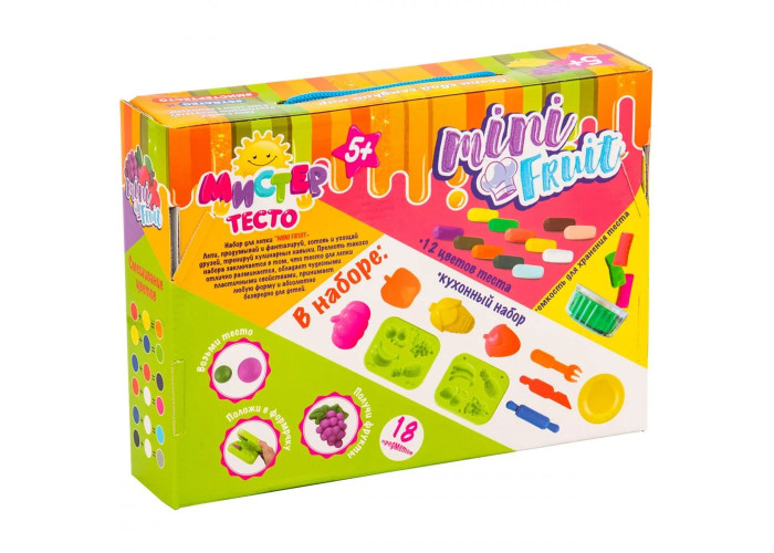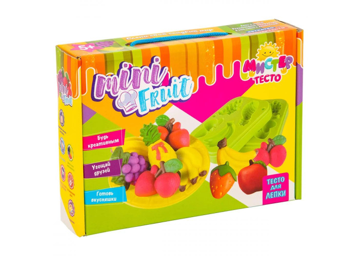 Ваш малюк любить пригощати друзів і готувати їжу? Приготувати фруктові салати і частування з овочів допоможе малюкові набір «Містер тісто - Mini Fruit». У цьому йому допоможуть різні формочки, в тому числі об'ємні 3D і кухонне приладдя. Готові страви можна сервірувати на спеціальній тарілочці. Можна сфантазувати будь-який вид смачного частування і виліпити його зі спеціального тіста. Тісто дуже пластичне, різні кольори легко змішуються, воно не забруднює руки і може приймати будь-яку форму. Має яскраві кольори і абсолютно безпечне. Готові ласощі можна укласти в спеціальну красиву коробочку.