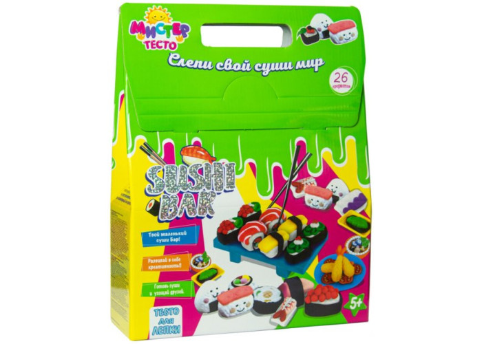Ваше маля любить готувати екзотичні страви? Допоможіть організувати ресторан японської кухні для веселої компанії за допомогою набору «Містер тісто - Sushi bar». Велика кількість різних видів суші – роли, сашимі, нігірі допоможуть відтворити форми, спеціальна фактурна каталка та ніж. Можна створити власний різновид екзотичної страви та виліпити її зі спеціального тіста.