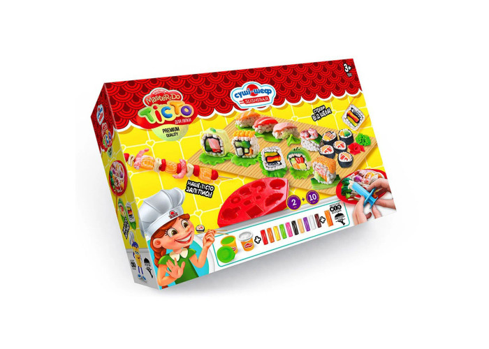 тесто для лепки в брикетах 10шт, тесто для лепки в баночках 2шт, шариковый пластилин 1шт, набор игрушечных столовых приборов, комплект из трех стеков, формочка для изготовления морепродуктов, поднос для суши, скалка, палочки для шашлыка 2шт, палочки для суши 2 шт, инструкция.