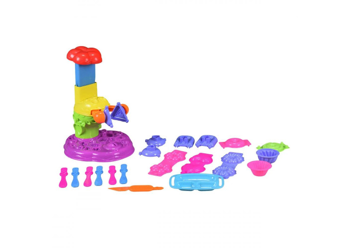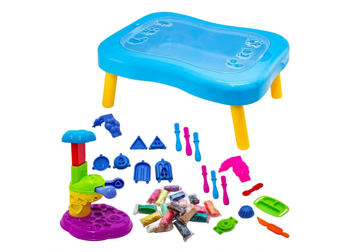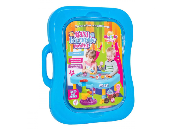 Ваш малюк любить морозиво і солодощі, а також пригощати ними друзів? Велике робоче місце для виготовлення ласощів «Містер тісто» виконано у вигляді валізки, яка легко перетворюється в столик. Верхня кришка столика знімається і під нею можна зберігати усі речі. Різні види смачних ласощів допоможуть відтворити формочки, в тому числі і об'ємні 3D, кухонний набір і спеціальна морозивниця. Готові вироби можна прикрасити деталями з тіста з блискітками. Тісто дуже пластичне, різні кольори легко змішуються, воно не забруднює руки і може приймати будь-яку форму.