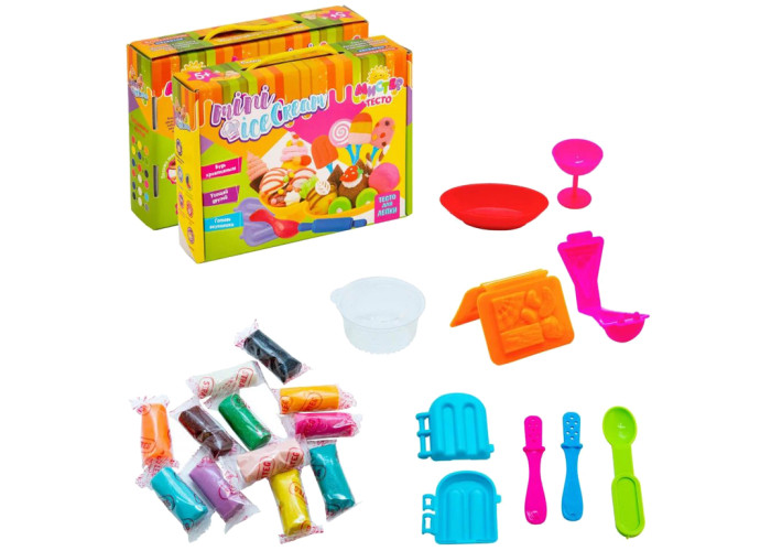 - Комплект: 12 паличок тіста (20 гр.), ємність для зберігання, качалка, ложка, стаканчик, 2 форми, тарілка, 2 палички для морозива