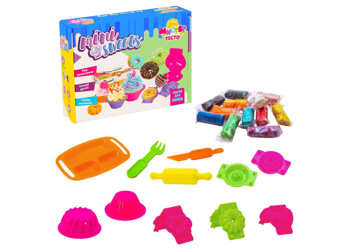 12 палочек теста (20 гр.), емкость для хранения, скалка, вилка, нож, поднос, 6 шт. формочек, коробочка