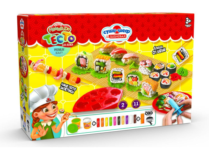 Комплектація: тісто для ліплення - 10 шт ., тісто для ліплення в баночках - 2 шт ., комплект з 3-х стеків, формочка для виготовлення морепродуктів - 1 шт ., піднос для суші - 1 шт ., скалка - 1 шт ., палички для шашлику - 2 шт ., палички для суші - 2 шт ., інструкція - 1 шт.