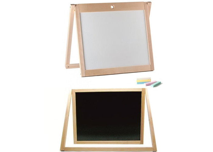 Дошка для малювання 2-стороння дерев'яна, настільна, одна сторона чорного кольору для малювання крейдою, інша - білого кольору для малювання фломастером на водній основі. У комплекті крейда і губка.