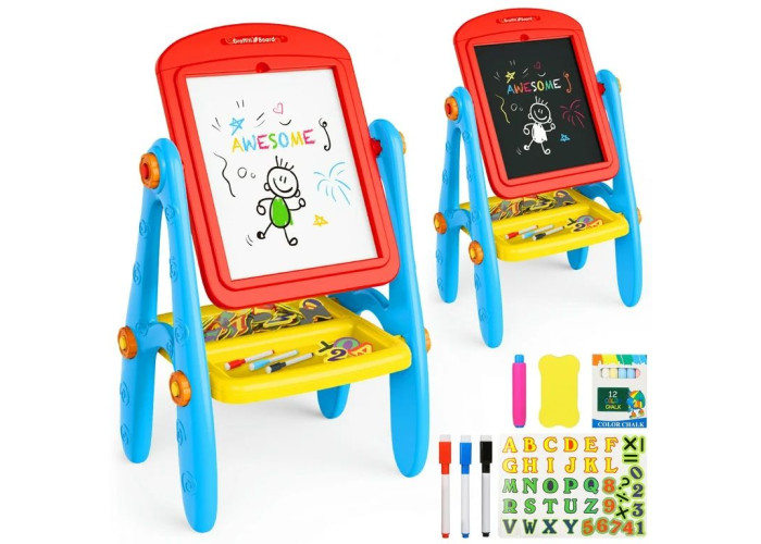 У набір входить 2 спеціальні кліпси для кріплення паперу, малюнків, фотографій та іншого, маркери, крейди, магніти, губка, набір з цифр і набір російського алфавіту на магнітній основі, а також внизу мольберта розташована зручна поличка з двома склянками, на якій можна розмістити різне канцелярське приладдя та предмети для малювання.
