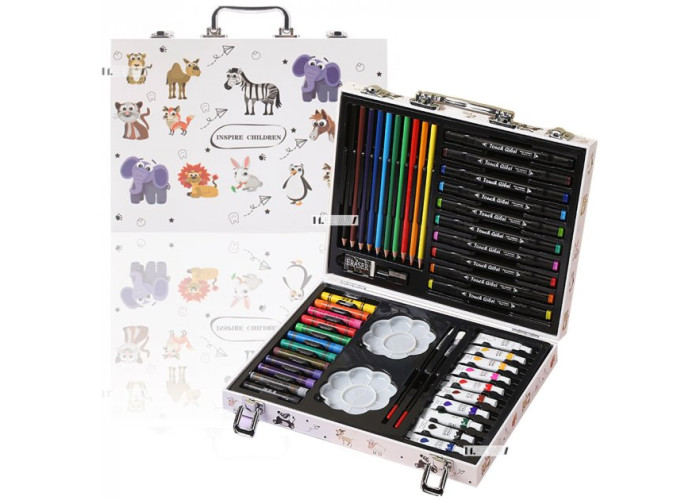 Комплектація: Кольорові олівці - 10 шт., Велика кисть - 1 шт., Маленька кисть - 1 шт., Фарби (різні кольори) - 10 шт., Двосторонній маркер - 10 шт., Масляна пастель - 12 шт., Стругачка для олівців - 1 шт., Гумка для стирання - 1 шт., Палітра для малювання - 2 шт., Валіза для зберігання.