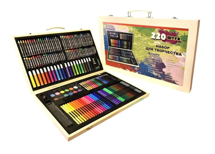 Великий художній набір чудово підійде для малюка-початківця. Він має 220 предметів на всі випадки: кілька різновидів олівців, фломастери, фарби, дитина зможе скуштувати всі стилі промальовування, в той же час ви не витратите зайві гроші.