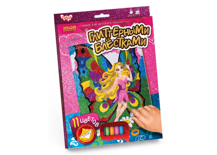 Набір розвиває фантазію, художній смак і прилучає дитину до мистецтва. На заготівлі нанесені цифри, які відповідають кольорам пакетиків з блискітками. Відокремлюючи захисний шар певного кольору засипте його глітером. Виробник цього набору, яка спеціалізується на випуску якісних наборів для дитячої творчості.