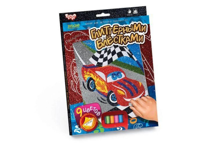 Набір розвиває фантазію, художній смак і прилучає дитину до мистецтва. На заготівлі нанесені цифри, які відповідають кольорам пакетиків з блискітками. Відокремлюючи захисний шар певного кольору засипте його глітером. Виробник цього набору, яка спеціалізується на випуску якісних наборів для дитячої творчості.