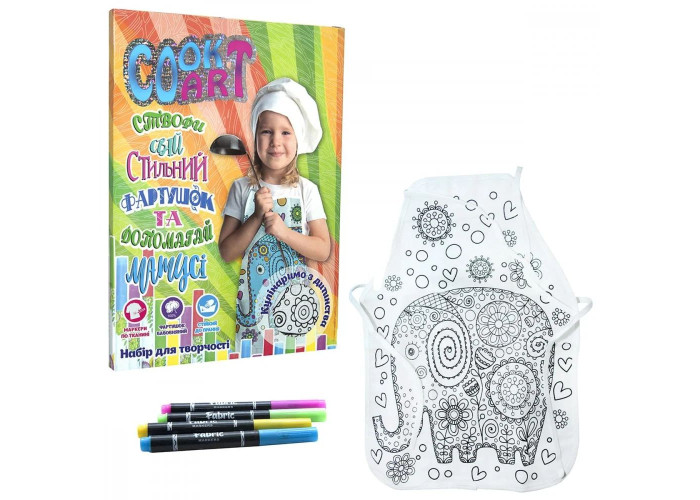 Набір для творчості справжнього маминого помічника. В ньому є бавовняний фартушок (підстава під розмальовку, набір яскравих маркерів). За допомогою фломастерів дитина створює стильний фартух, в якому приємно і грати, і допомагати батькам. Розмальовувати фартушок цікаво, заняття до душі і хлопчикам і дівчаткам. Набір призначений для дітей дошкільного віку.