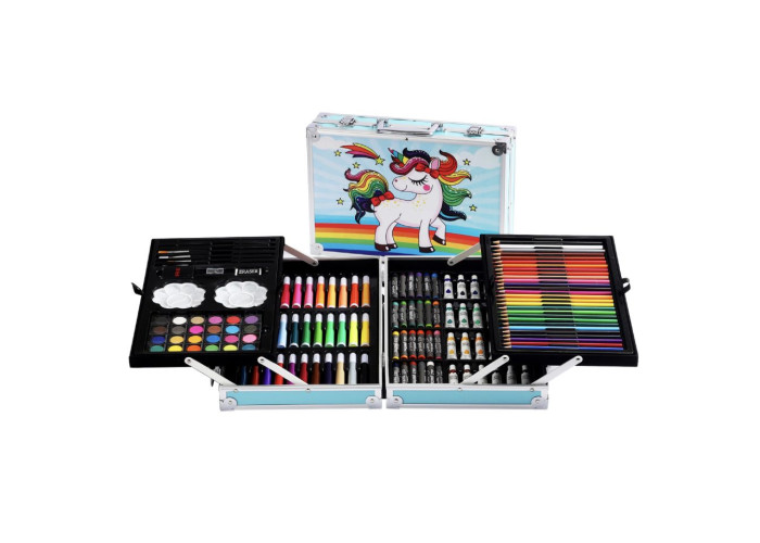Дитячий набір для творчості художника "Єдиноріг" — в кейсі ви знайдете 145 предметів, які допоможуть дитині розвинути креативність, фантазію, дрібну моторику і спробувати себе в ролі художника, помалювати різними олівцями і фарбами, поекспериментувати в колірних поєднаннях і відчути себе справжнім творцем. Також науково доведено, що подібний дозвілля позитивно впливає на розвиток мовного центру. Всі предмети, включаючи фарби, абсолютно безпечні в їх склад не входять компоненти, які могли б негативно позначитися на здоров'ї дитини.