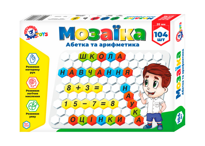 Мозаїка Абетка та арифметика складається з ігрового поля та 104 елементів. Розмір деталі - 2 см. Кожній детальці відповідає певний колір: приголосні глухі - зелений колір; приголосні дзвінкі - блакитний колір; голосні – червоний колір; м'який та твердий знак - білі;