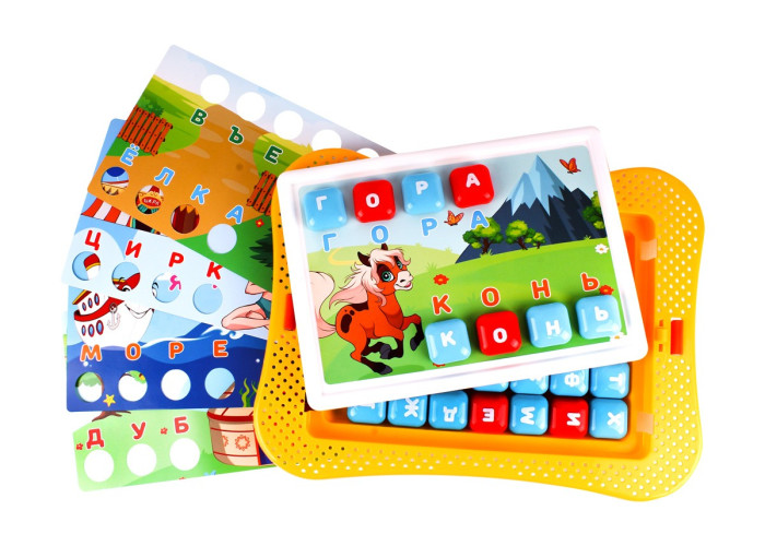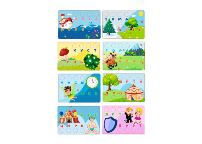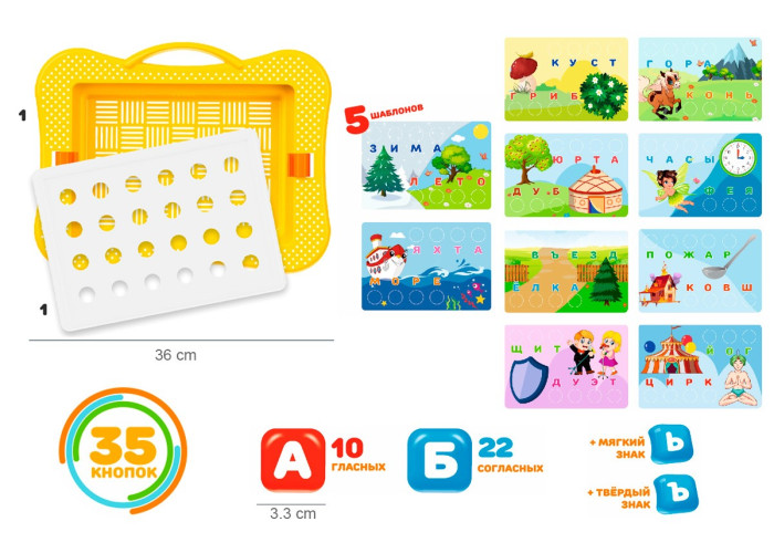 Для складання слів є 5 двосторонніх кольорових шаблонів з цупкого паперу та отворами для кнопок. Під отворами підписані букви, що складаються у слова. Тематичні зображення на шаблонах – як підказка, що допоможе малюкам скоріше та краще запам'ятати слова та букви. Після опанування всіх слів на картинках, дітки також можуть складати самостійно нові слова відразу на полі.
