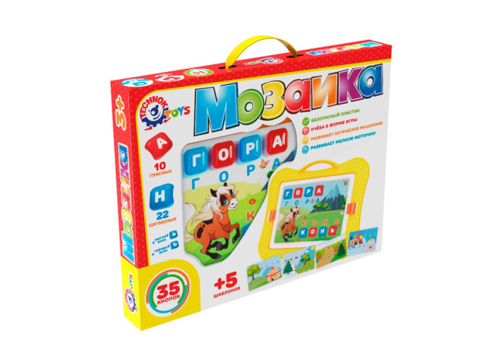 У "Мозаїці ТехноК" є все для цікавого дозвілля та ефективного навчання. На велику яскраву валізку з ручкою кріпиться пластикове поле з отворами. В комплекті - 35 кнопок з нанесеними буквами: 10 голосних та 22 приголосних, мякий знак, твердий знак. Колір кнопок підібраний спеціально до букви - голосні на червоних, а приголосні на блакитних.
