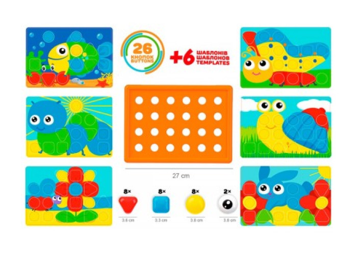 Складається Мозаїка з 32 елементів: 26 фішок-кнопок та 6 спеціальних трафаретів. Фішки не просто різнокольорові, вони ще й різної форми. До того ж, на двох із них нанесено малюнок у вигляді очей. Тому після того, як малюк збере мозаїку, звірята на картинках «оживуть».