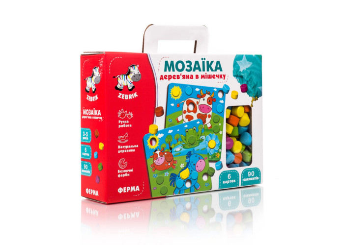 Комплектація: 6 гральних полів, 90 елементів мозаїки, мішечок.