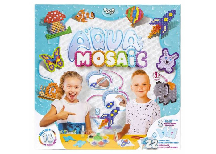 Набір для творчості AQUA MOSAIC - це цікаве заняття для дітей віком 6+. Вам потрібно по трафарету з намистин зібрати картинку, потім змочити її з пульвелізатора водою і залишити для повного висихання на 1-2 години. За цей час намистинки скляться між собою, утворивши цільну фігурку. Можна також доповнити плоску фігурку, що вийшла, бусинками для додання об'єму. У наборі пакетики з намистинками різного кольору, картинки та необхідні предмети для створення малюнка. Цей набір розвиває креатив та творчий потенціал, вчить посидючості та старанності.