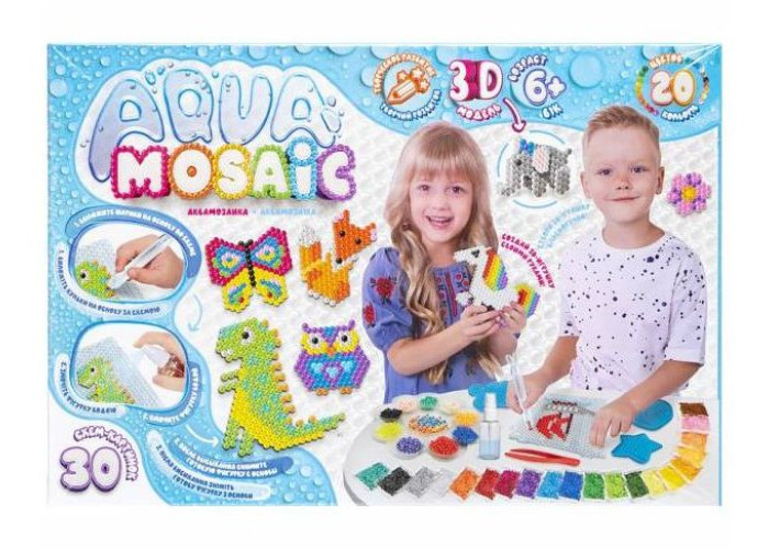 Набір для творчості AQUA MOSAIC - це цікаве заняття для дітей віком 6+. Вам потрібно по трафарету з намистин зібрати картинку, потім змочити її з пульвелізатора водою і залишити для повного висихання на 1-2 години. За цей час намистинки скляться між собою, утворивши цільну фігурку. Можна також доповнити плоску фігурку, що вийшла, бусинками для додання об'єму. У наборі пакетики з намистинками різного кольору, картинки та необхідні предмети для створення малюнка. Цей набір розвиває креатив та творчий потенціал, вчить посидючості та старанності.