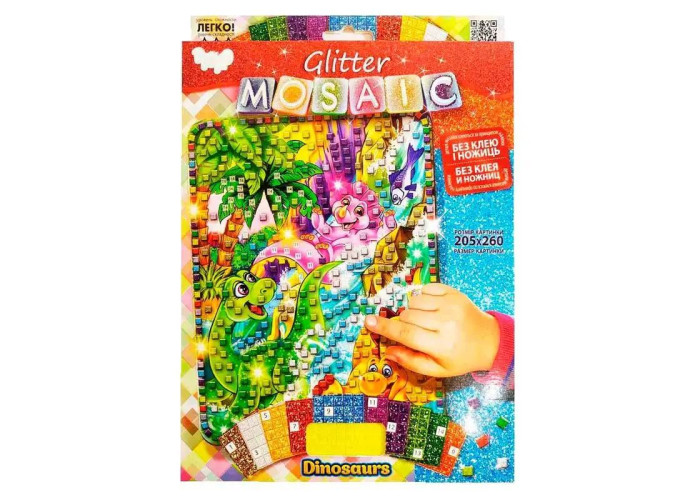 У наборі гнучкі палетки різних кольорів. Кожен кольоровий блок має номер. Дитина вибирає і відокремлює елементи мозаїки за номером та кольором і кріпить палетки на картонну основу-заготовку. В результаті зусиль і копіткої праці виходить кольорова картинка-мозаїка, зроблена своїми руками. Розмір упаковки: 29,5х21,5 см. Розмір картинки: 20,5х26 см.