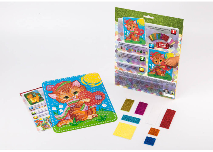 У наборі гнучкі палетки різних кольорів. Кожен кольоровий блок має номер. Дитина вибирає і відокремлює елементи мозаїки за номером та кольором і кріпить палетки на картонну основу-заготовку. В результаті зусиль і копіткої праці виходить кольорова картинка-мозаїка, зроблена своїми руками. Розмір упаковки: 29,5х21,5 см. Розмір картинки: 20,5х26 см.