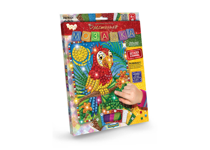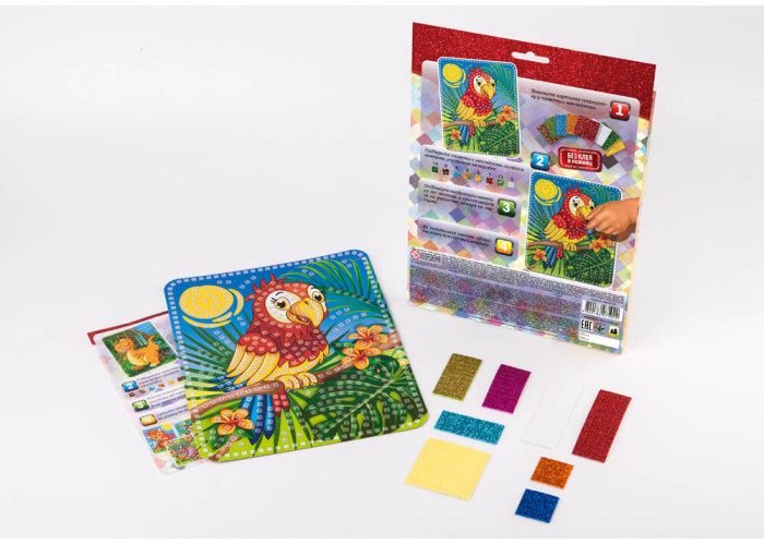 У наборі гнучкі палетки різних кольорів. Кожен кольоровий блок має номер. Дитина вибирає і відокремлює елементи мозаїки за номером та кольором і кріпить палетки на картонну основу-заготовку. В результаті зусиль і копіткої праці виходить кольорова картинка-мозаїка, зроблена своїми руками. Розмір упаковки: 29,5х21,5 см. Розмір картинки: 20,5х26 см.