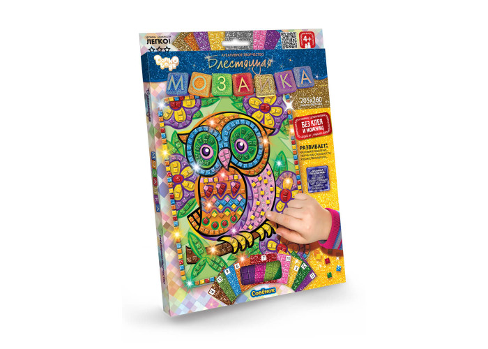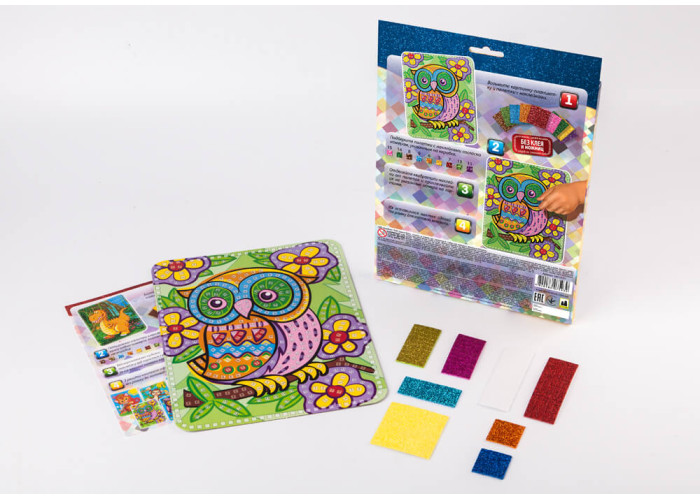 У наборі гнучкі палетки різних кольорів. Кожен кольоровий блок має номер. Дитина вибирає і відокремлює елементи мозаїки за номером та кольором і кріпить палетки на картонну основу-заготовку. В результаті зусиль і копіткої праці виходить кольорова картинка-мозаїка, зроблена своїми руками. Розмір упаковки: 29,5х21,5 см. Розмір картинки: 20,5х26 см.